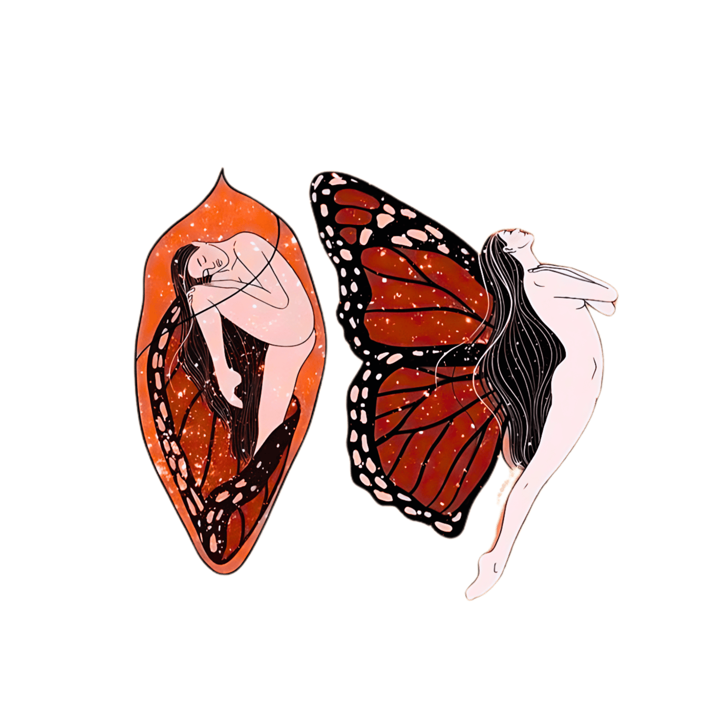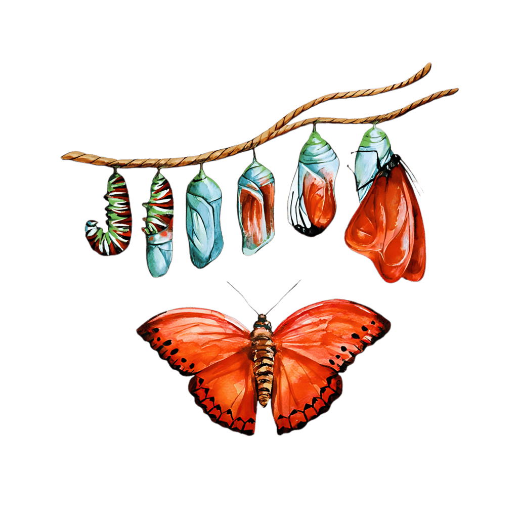 Nossa vida é como as fases de uma borboleta. No útero de nossa mãe, estamos no casulo, protegidas e em desenvolvimento. À medida que crescemos, passamos pelas fases de menina e criança, assim como a borboleta passa pela fase de lagarta, aprendendo e evoluindo a cada passo.