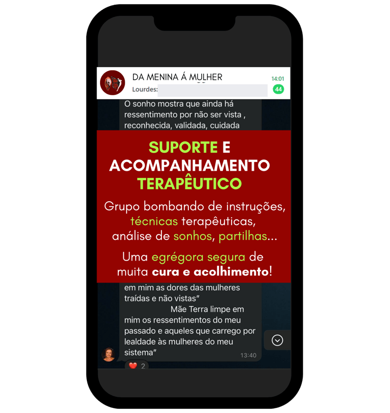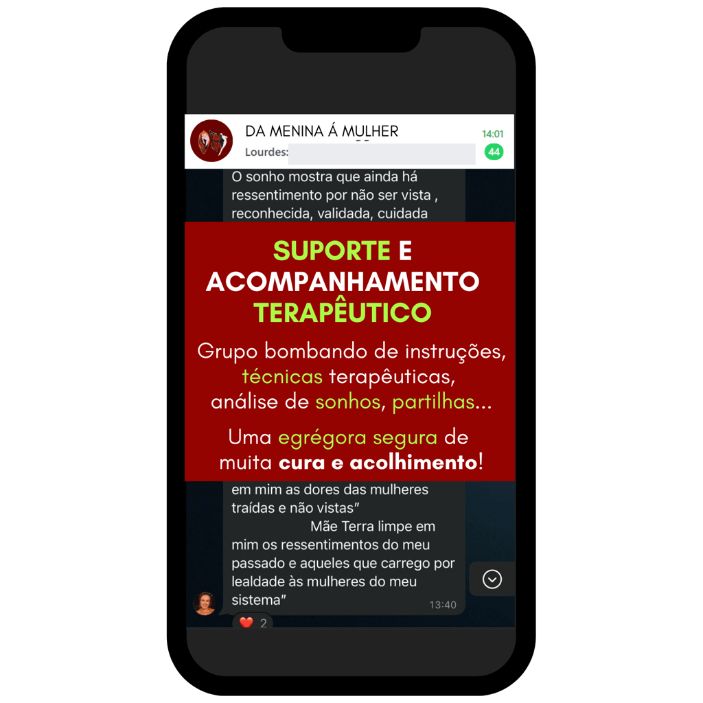 No grupo você tem contato direto com a Terapeuta, facilitando esse acompanhamento de toda sua jornada! A troca diária entre o próprio grupo, entre todas as mulheres e também de vocês alunas com a facilitadora, torna a experiência mais rica e profunda, se tornando uma egrégora de cura!
